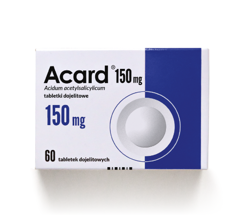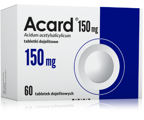 Skład i postać: Każda tabletka dojelitowa zawiera odpowiednio 75 mg (Acard) lub 150 mg (Acard 150 mg) kwasu acetylosalicylowego. Wskazania: Choroba niedokrwienna serca oraz wszelkie sytuacje kliniczne, w których celowe jest hamowanie agregacji płytek krwi: zapobieganie zawałowi serca u osób dużego ryzyka, świeży zawał serca lub podejrzenie świeżego zawału serca, niestabilna choroba wieńcowa (Acard 150 mg: po przebytym epizodzie niestabilnej choroby wieńcowej), prewencja wtórna u osób po przebytym zawale serca, stan po wszczepieniu pomostów aortalno‑wieńcowych, angioplastyce wieńcowej, zapobieganie napadom przejściowego niedokrwienia mózgu (TIA) i niedokrwiennego udaru mózgu u pacjentów z TIA, po przebytym udarze niedokrwiennym mózgu u pacjentów z TIA, u osób z zarostową miażdżycą tętnic obwodowych, zapobieganie zakrzepicy naczyń wieńcowych u pacjentów z mnogimi czynnikami ryzyka, zapobieganie zakrzepicy żylnej i zatorowi płuc u pacjentów długotrwale unieruchomionych, np. po dużych zabiegach chirurgicznych jako uzupełnienie innych sposobów profilaktyki. Decyzję o rozpoczęciu leczenia kwasem acetylosalicylowym i stosowanej dawce powinien podjąć lekarz. Podmiot odpowiedzialny: Polfa Warszawa S.A. ChPL Acard: 2020.03.13. Acard 150: 2019.06.05.