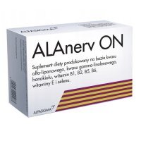 Alanerv On to suplement diety produkowany na bazie kwasu alfa-liponowego, kwasu gamma-linolenowego, honokiolu, selenu, witamin B1, B2, B5, B6 oraz witaminy E.