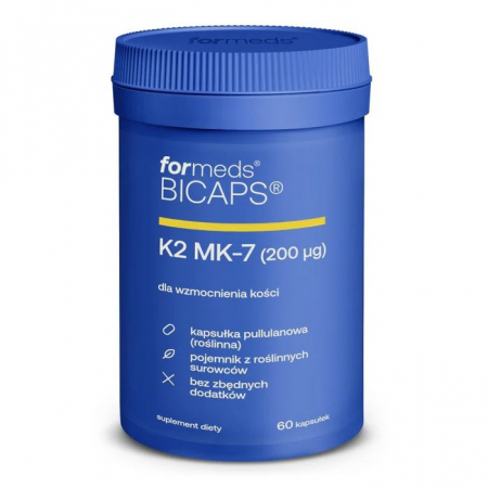 Bicaps K2 MK-7 to suplement diety zawierający najlepiej przyswajalną formę witaminy K (K2 MK-7), która jest wykorzystywana przez wątrobę i redystrybuowana przez krew do całego organizmu.