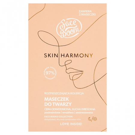 BIELENDA FaceBoom Skin Harmony Rozpieszczająca Kolekcja Maseczek do twarzy została stworzona do pielęgnacji cery odwodnionej, suchej i mieszanej z widocznymi oznakami podrażnienia, stresu i zmęczenia, zgodnej z jej dobowym rytmem.