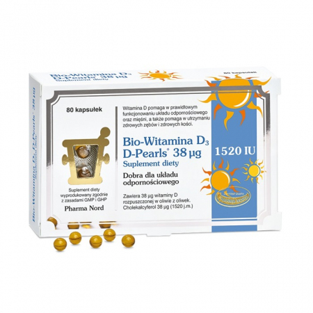 Bio-Witamina D3 D-Pearls to miękkie żelatynowe kapsułki zawierające 38 mikrogramów witaminy D3 (1520 j.m.) w każdej kapsułce. Witamina D jest rozpuszczona w oliwie z oliwek tłoczonej na zimno dla ułatwienia wchłaniania w układzie pokarmowym. Rozmiar kapsułki ułatwia połykanie, ale można ją również żuć.