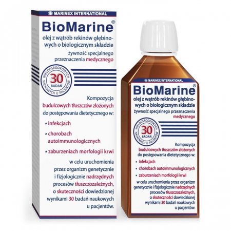 BioMarine olej to biologiczny olej z wątroby rekinów głębinowych z Południowo-Zachodniego Oceanu Spokojnego i Morza Tasmana (Australia, Nowa Zelandia). Produkt jest przeznaczony do postępowania dietetycznego u dorosłych i dzieci powyżej 6 miesiąca życia.