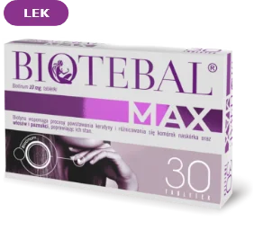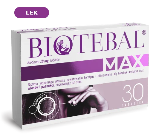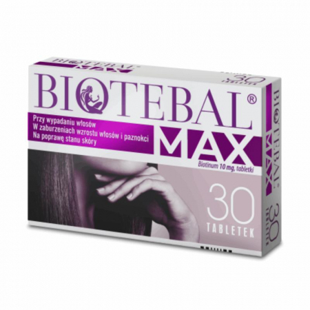 Biotebal MAX. Skład i postać: Każda tabletka zawiera 10 mg biotyny. Substancja pomocnicza o znanym działaniu: laktoza jednowodna. Każda tabletka zawiera 107,8 mg laktozy jednowodnej. Wskazania: Leczenie niedoboru biotyny z takimi objawami jak: wypadanie włosów, zaburzenia wzrostu włosów i paznokci oraz ich nadmierna łamliwość, stany zapalne skóry zlokalizowane wokół oczu, nosa, ust i uszu, oraz zapobieganie jego następstwom, po wykluczeniu przez lekarza innych przyczyn. Podmiot odpowiedzialny: Zakłady Farmaceutyczne Polpharma S.A. Lek wydawany bez recepty. ChPL: 01.10.2021
