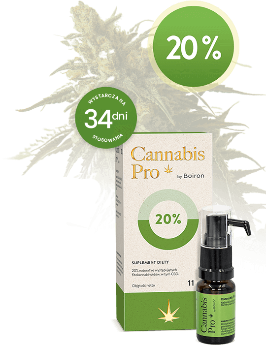 Cannabis Pro by Boiron 20% to suplement diety, zawierający w swoim składzie olej z nasion konopii włóknistych bogaty w fitokannabinoidy, w tym CBD.