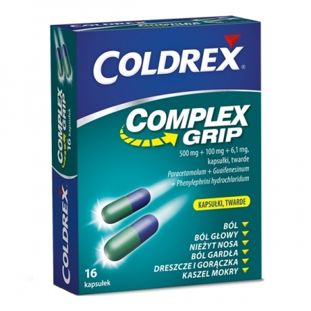 Potrójna formuła kapsułek Coldrex Complex Grip działa na 7 objawów przeziębienia i grypy, w tym kaszel mokry: