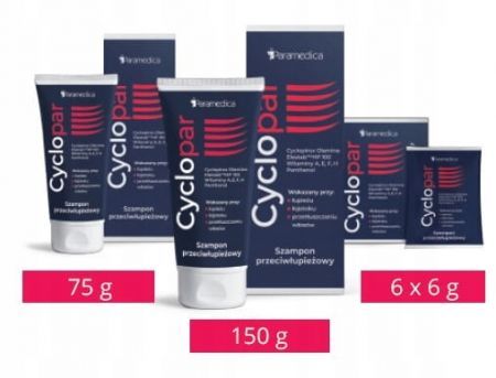 Szampon przeciwłupieżowy Cyclopar to kosmetyk przeznaczony do problematycznej skóry głowy z łupieżem, łojotokiem i tłustymi włosami. W skład szamponu wchodzą substancje regulujące wydzielanie sebum, przeciwłupieżowe oraz przeciwświądowe (Cyclopirox, Elestab™HP 100). Dodatkowo skład szamponu Cyclopar wzmocniony został składnikami pielęgnującymi, rewitalizującymi i odżywczymi (vit. A, E, F, H, Pathenol, Gliceryna).