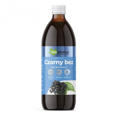 EkaMedica Czarny bez NFC suplement diety w formie płynnej, wyprodukowany z soku 100% z owoców czarnego bzu z dodatkiem naturalnej witaminy C pochodzącej z ekstraktu z owoców camu camu. Pasteryzowany.