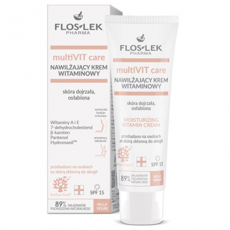 Flos-Lek Multi-Vit Care krem nawilżający to lekki kosmetyk zawierający kompleks witamin oraz filtr przeciwsłoneczny SPF 15 przeznaczony do pielęgnacji dojrzałej i osłabionej skóry twarzy, szyi i dekoltu.