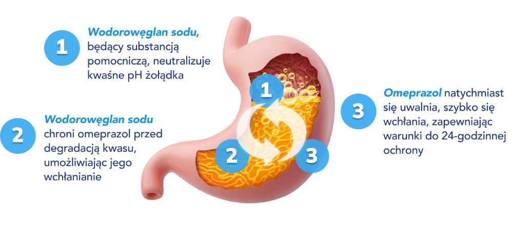 Sposób stosowania:- Kapsułkę należy przyjmować na pusty żołądek, codziennie o tej samej porze. Pusty żołądek oznacza co najmniej 30 minut przed jedzeniem i co najmniej 2 godziny po ostatnim posiłku (np. rano przed śniadaniem). Lek zawiera substancję pomocniczą wodorowęglan sodu, który chroni substancję czynną omeprazol przed rozpadem pod wpływem kwasu w żołądku. W przypadku przyjmowania leku podczas posiłku działanie ochronne wodorowęglanu sodu jest zmniejszone i lek może nie działać w pełni.