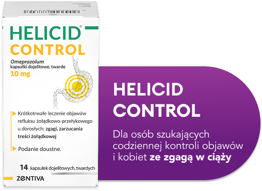 Wskazania do stosowania: Helicid Control jest wskazany do stosowania w leczeniu objawów refluksu żołądkowo-przełykowego (np. zgaga, zarzucanie kwaśnej treści żołądkowej