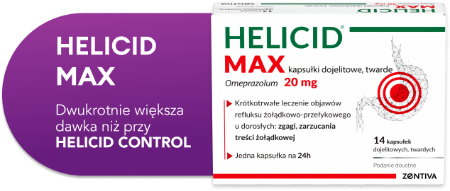 HELICID MAX, 20 mg, kapsułki dojelitowe, twarde. Jedna kapsułka zawiera 20 mg omeprazolu (Omeprazolum).