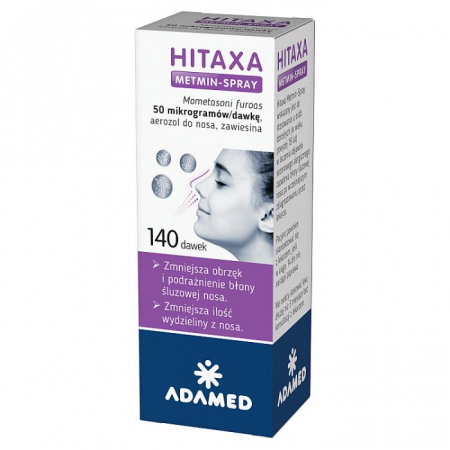 Hitaxa Metmin-Spray zawiera substancję czynną mometazonu furoinian, który należy do leków zwanych kortykosteroidami. Mometazonu furoinianu nie należy mylić ze steroidami anabolicznymi w postaci tabletek lub zastrzyków, które są używane niezgodnie z przeznaczeniem przez niektórych sportowców. Mometazonu furoinian podany donosowo łagodzi objawy zapalenia błony śluzowej nosa (obrzęk i podrażnienie błony śluzowej nosa), kichanie, świąd oraz uczucie zatkanego nosa i zmniejsza ilość wydzieliny z nosa.