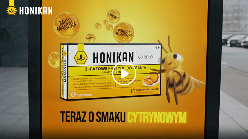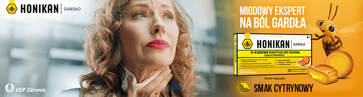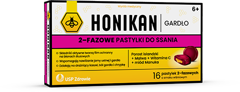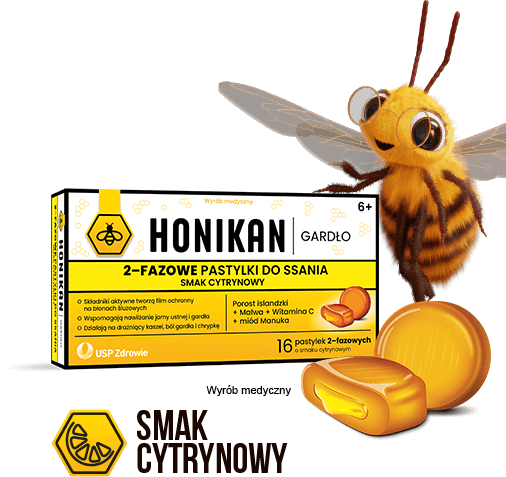 HONIKAN GARDŁO 2-FAZOWE PASTYLKI DO SSANIA SMAK CYTRYNOWY, wyrób medyczny, 16 pastylek wskazane są w terapii drażniącego kaszlu, bólu gardła i chrypki (np. przy przeziębieniu) oraz wspomagają naturalne nawilżanie błony śluzowej jamy ustnej i gardła. Składniki aktywne: