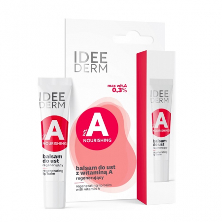 Idee Derm balsam do ust to odżywczy kosmetyk, który działa jak maseczka. Przyjemnie otula, wygładza i koi spierzchnięte usta – intensywnie regeneruje i nawilża. Jest wygodny w aplikacji i nie spływa z ust. Balsam do ust z witaminą A głęboko odżywia i chroni usta w każdych warunkach pogodowych, również zimą.