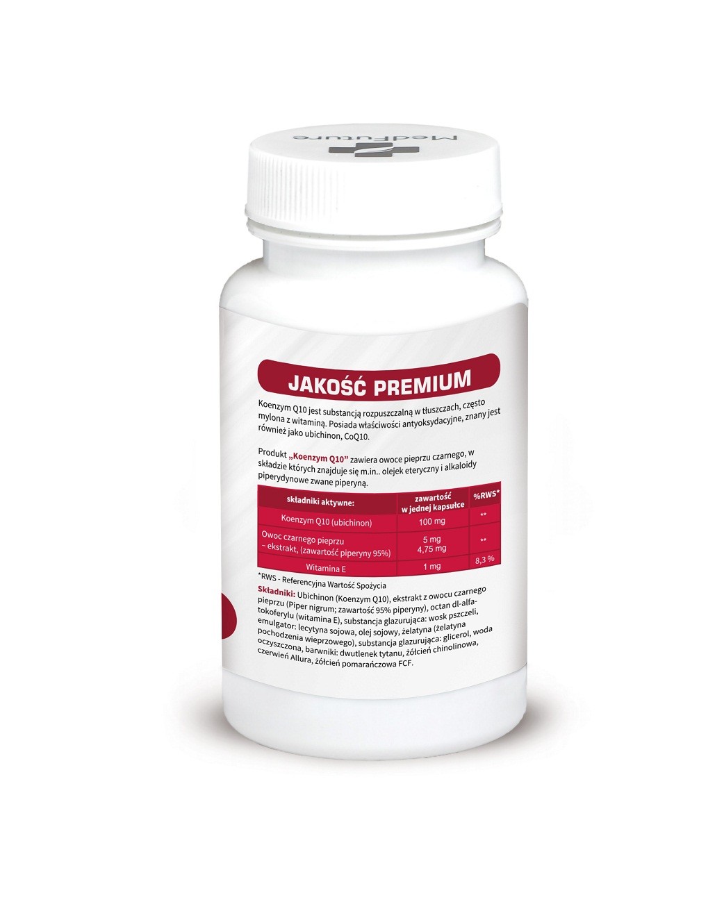 Ubichinon (Koenzym Q10), ekstrakt z owocu czarnego pieprzu (Piper nigrum; zawartość 95% piperyny), octan dl-alfa-tokoferylu (witamina E), substancja glazurująca: wosk pszczeli, emulgator: lecytyna sojowa, olej sojowy, żelatyna (żelatyna pochodzenia wieprzowego), substancja glazurująca: glicerol, woda oczyszczona, barwniki: dwutlenek tytanu, żółcień chinolinowa, czerwień Allura, żółcień pomarańczowa FCF.