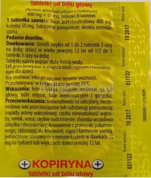 Kopiryna to lek przeciwbólowy o wysokiej skuteczności działania. Preparat zawiera dwie substancje czynne: kwas acetylosalicylowy u działaniu przeciwbólowym, przeciwgorączkowym i przeciwzapalnym. Uważa się, że kofeina wspomaga działanie kwasu acetylosalicylowego przy bólach głowy.