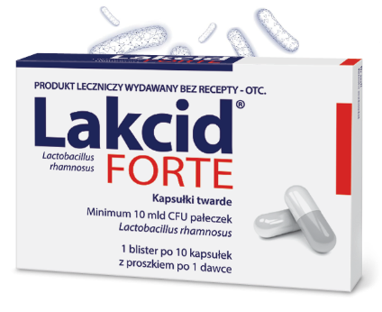 Lakcid forte. Skład i postać: Każda kapsułka twarda zawiera minimum 10 mld CFU pałeczek Lactobacillus rhamnosus: Szczep Lactobacillus rhamnosus Pen ‑ 40%; Szczep Lactobacillus rhamnosus E/N ‑ 40%; Szczep Lactobacillus rhamnosus Oxy ‑ 20%; Pałeczki oporne na: amoksycylinę, ampicylinę, azlocylinę, cefepim, cefotaksym, cefradynę, ceftazydym, cefuroksym, doksycyklinę, erytromycynę, gentamycynę, imipenem, klindamycynę, kloksacylinę, kolistynę, kotrimoksazol, kwas nalidyksowy, meropenem, metronidazol, neomycynę, netylmycynę, penicylinę, piperacylinę, streptomycynę, teikoplaninę, tobramycynę, wankomycynę. CFU — jednostka formowania kolonii (ang. Colony Forming Unit). Substancje pomocnicze o znanym działaniu: sacharoza, laktoza, żółcień pomarańczowa (E110). Każda kapsułka zawiera 115 mg sacharozy i 83 mg laktozy. Kapsułki twarde, celulozowe, składające się z dwóch cylindrycznych części. Przed rekonstytucją proszek w kapsułce ma postać sypkich, rozdrobnionych cząstek o zabarwieniu od jasno do ciemnobeżowego. Po rekonstytucji powstaje homogenna zawiesina, bez widocznych zanieczyszczeń. Wskazania: Poantybiotykowe zapalenie jelit ze szczególnym uwzględnieniem leczenia wspomagającego rzekomobłoniastego zapalenia okrężnicy; jako leczenie głównie przy nawracającym rzekomobłoniastym zapaleniu okrężnicy. Zapobieganie biegunce podróżnych. Leczenie wspomagające w czasie i po antybiotykoterapii. Podmiot odpowiedzialny: Zakłady Farmaceutyczne Polpharma S.A. Pozwolenie na dopuszczenie do obrotu nr 21228 wydane przez MZ. Lek wydawany bez recepty. ChPL: 2021.03.18.