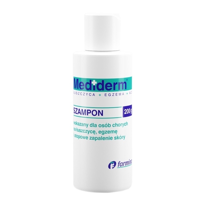 Mediderm szampon jest wyrobem medycznym opracowanym w celu utrzymania zdrowego stanu skóry głowy w przebiegu łuszczycy, egzemy i atopowego zapalenia skóry.