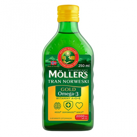 Mollers Gold Tran Norweski to wysokiej jakości i czystości tran z dorsza. Stanowi uzupełnienie diety w niezbędne kwasy omega-3 i witaminy potrzebne dla zdrowia. Formuła zawiera zwiększoną zawartość witaminy D3.