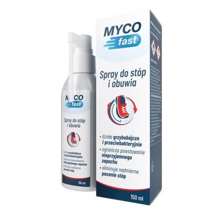 Mycofast spray do stóp i obuwia to płyn przeznaczony do dezynfekcji wnętrza obuwia o działaniu bakteriobójczym i grzybobójczym oraz do nieuszkodzonej, chorobowo niezmienionej skóry stóp o działaniu bakteriobójczym i drożdżakobójczym.
