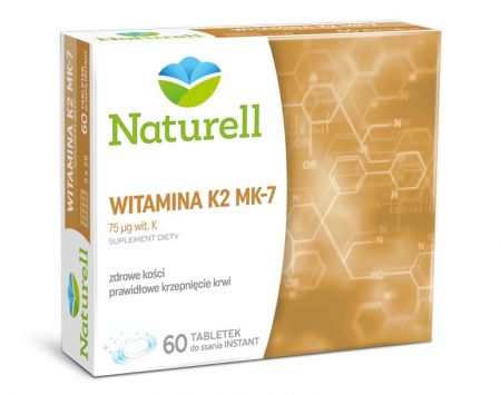 Składniki: substancja wypełniająca: mannitol; skrobia; witamina K (menachinon MK-7); substancja glazurująca: kwasy tłuszczowe (kwas stearynowy); skrobia modyfikowana: hydroksypropyloskrobia; aromat; substancje glazurujące: dwutlenek krzemu, sole magnezowe kwasów tłuszczowych (stearynian magnezu). Może zawierać śladowe ilości skorupiaków, ryb, soi i ich produktów pochodnych. Naturell Witamina K2 MK-7 zawiera substancję słodzącą.