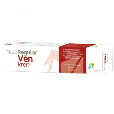 NutriRegular Ven krem to produkt o bogatej formule, która wykorzystuje wszystkie główne ekstrakty o działaniu ochronnym na naczynia krwionośne i flebotonicznym, przez który rozumiemy zwiększenie napięcia naczyniowego, zmniejszenie zastoju i przepuszczalności ściany naczyniowej, przy równoczesnej poprawie w zakresie drenażu limfatycznego i funkcji mikrokrążenia.