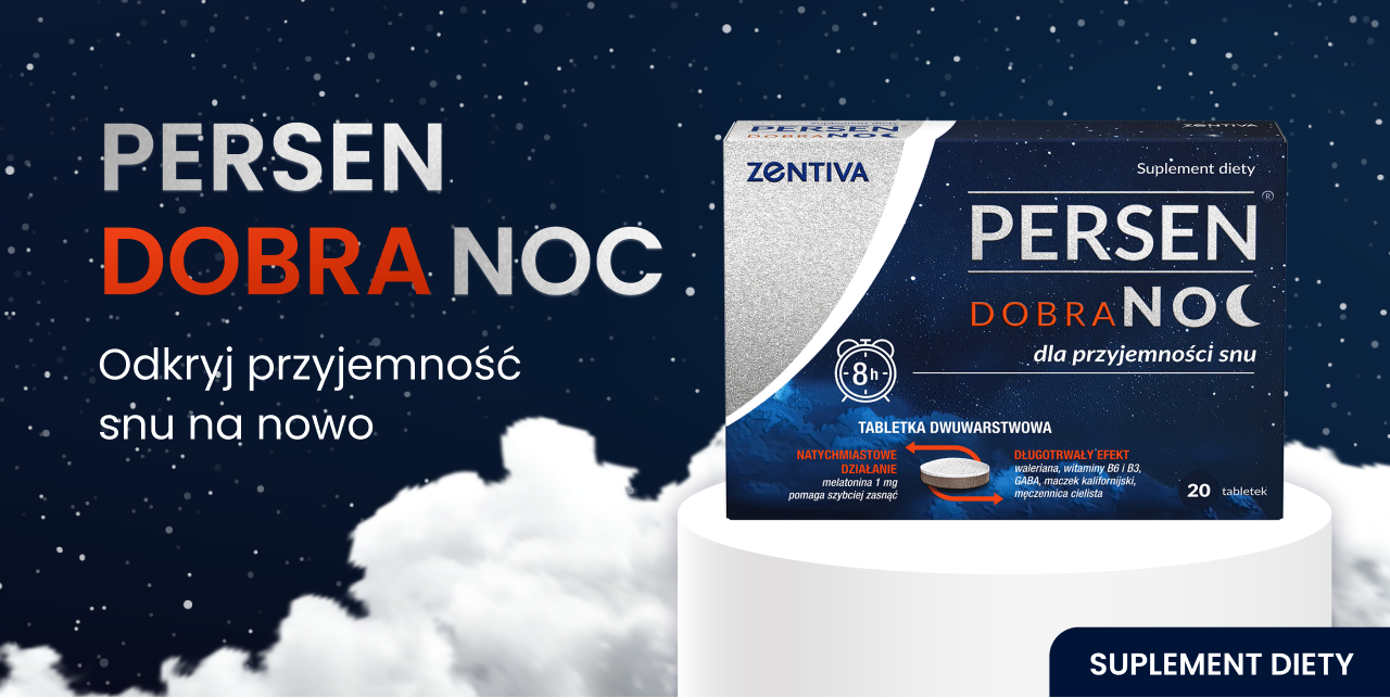 Persen Dobranoc to suplement diety zawierający melatoninę, GABA, ekstrakty z waleriany, ziela męczennicy cielistej, maczka kalifornijskiego, witaminę B3, oraz witaminę B6.
