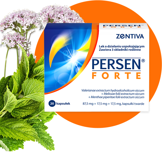 Persen Forte jest lekiem roślinnym stosowanym tradycyjnie w łagodnych stanach napięcia nerwowego i trudnościach w zasypianiu. Kapsułki na stres zawierają wyciągi z korzenia kozłka, liści melisy i liści mięty tradycyjnie stosowane w lekach o działaniu uspokajającym.