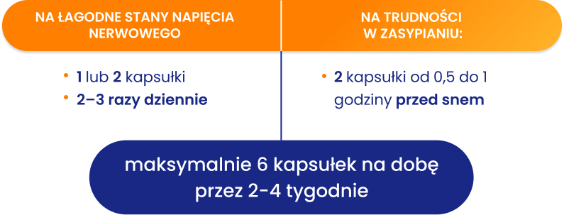 - w łagodnych stanach napięcia nerwowego: 1 lub 2 kapsułki dwa lub trzy razy na dobę,