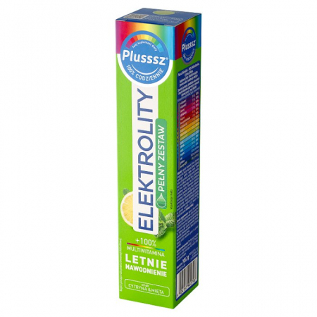 Plusssz Elektrolity +100% Multiwitamina smak malina i granat to suplement diety, który zawiera najważniejsze składniki potrzebne do prawidłowego funkcjonowania organizmu, szczególnie w upalne dni. Preparat Plusssz Elektrolity + Multiwitamina zawiera potas, magnez, chlorek, wapń i sód z glukozą oraz witaminy. Elektrolity tabletki musujące to idealne rozwiązanie dla osób aktywnych, które potrzebują wsparcia po treningu. Produkt jest polecany w czasie upałów, podróży, aktywności sportowej, wysiłku umysłowego, pracy fizycznej i po nadmiernym spożyciu alkoholu.