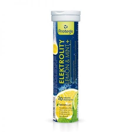 Protego Elektrolity Lemon&Mint+ to suplement diety o smaku cytrynowo miętowym w postaci tabletek musujących zawierający kluczowe elektrolity, jak sód, potas, chlorek, wapń, magnez, dodatkowo wzbogacony o witaminę C i glukozę. Są one niezbędne do prawidłowego funkcjonowania organizmu i gwarantują optymalne nawodnienie organizmu.