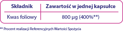 Zawartość w 1 kapsułce kwasu foliowego to 800 ug (400%*).
