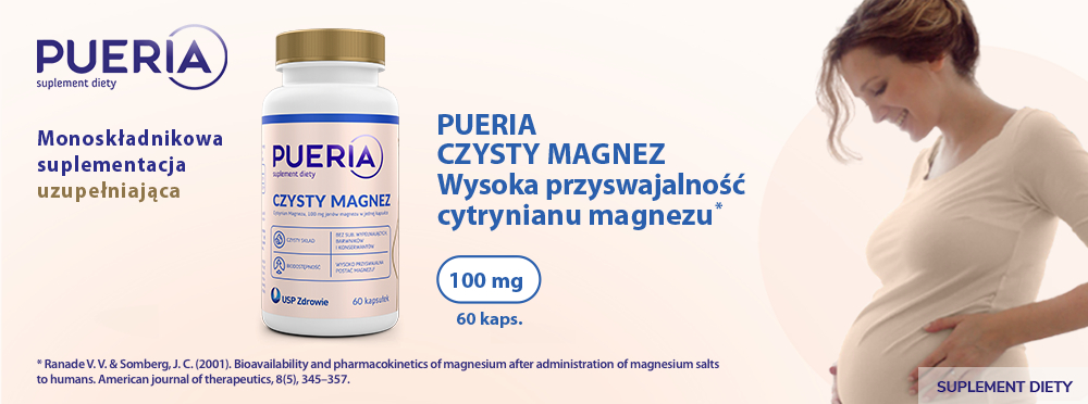 Pueria Czysty Magnez to monosuplement diety zawierający 100 mg jonów magnezu z organicznego cytrynianu magnezu w jednej kapsułce, bez dodatku substancji wypełniających, barwników i konserwantów syntetycznego pochodzenia.
