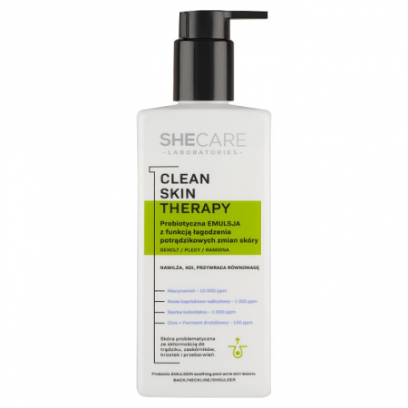 SheCare Clean Skin Therapy emulsja probiotyczna to kosmetyk, który regeneruje skórę, której struktury zostały uszkodzone przez trądzik. SheCare emulsja na zmiany potrądzikowe zmniejsza widoczność zmian skórnych i jest wsparciem w ograniczeniu niedoskonałości, na takich obszarach jak dekolt, plecy i ramiona.