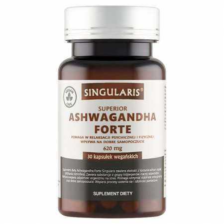 OpisSuplement diety Ashwagandha Forte Singularis zawiera ekstrakt z korzenia withani ospałej. Zawiera substancje z grupy trójterpenów inaczej witanolidów.