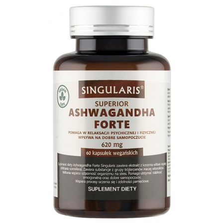 OpisSuplement diety Ashwagandha Forte Singularis zawiera ekstrakt z korzenia withani ospałej. Zawiera substancje z grupy trójterpenów inaczej witanolidów.