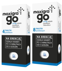 Maxigra Go.Skład i postać: Każda tabletka powlekana zawiera 25 mg syldenafilu w postaci syldenafilu cytrynianu. Wskazania: Produkt leczniczy Maxigra Go jest wskazany do stosowania u dorosłych mężczyzn z zaburzeniami erekcji, czyli niezdolnością uzyskania lub utrzymania erekcji prącia wystarczającej do odbycia stosunku płciowego. W celu skutecznego działania produktu leczniczego Maxigra Go niezbędna jest stymulacja seksualna. Podmiot odpowiedzialny: Zakłady Farmaceutyczne Polpharma S.A. Pozwolenie na dopuszczenie do obrotu nr 26546 wydane przez MZ ‑ dla tabletek powlekanych. Lek wydawany bez recepty.ChPL: 2021.07.23