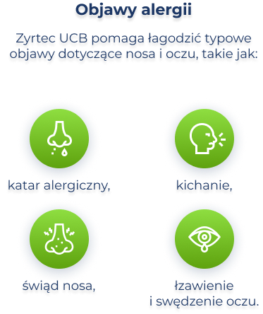 Cetyryzyna jest wskazana w łagodzeniu objawów dotyczących nosa i oczu, związanych z sezonowym i przewlekłym alergicznym zapaleniem błony śluzowej nosa.