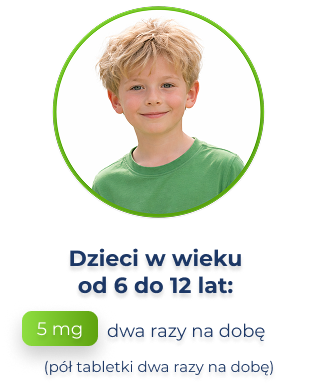 Dzieci w wieku od 6 lat do 12 lat: 5 mg dwa razy na dobę (pół tabletki dwa razy na dobę).